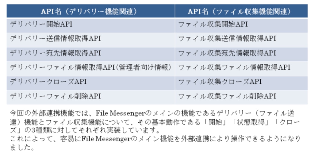 File Messengerを外部連携APIによってデリバリーやファイル収集の操作や状況取得を行うインターフェース。