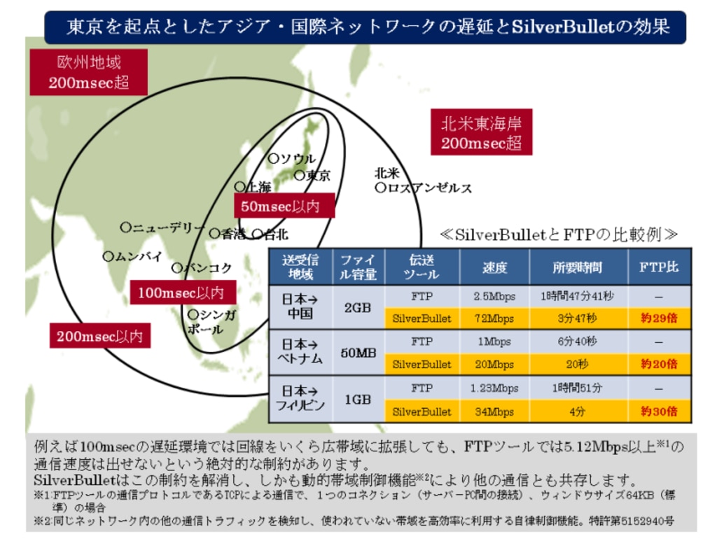 独自開発の通信プロトコルSSBP※1により、インターネット上で高速伝送するソフトウェア「SilverBullet」は2011年のリリース以降、放送・アニメ―ション制作、研究・開発機関、大手製造業などを中心に120社を超える顧客企業に導入・利用されています。また、昨秋にはHTTP(S)通信の高速化機能やモバイル対応機能を持つSDK※2を発表し、その後、一部改廃を含めてラインナップを整備してまいりました。