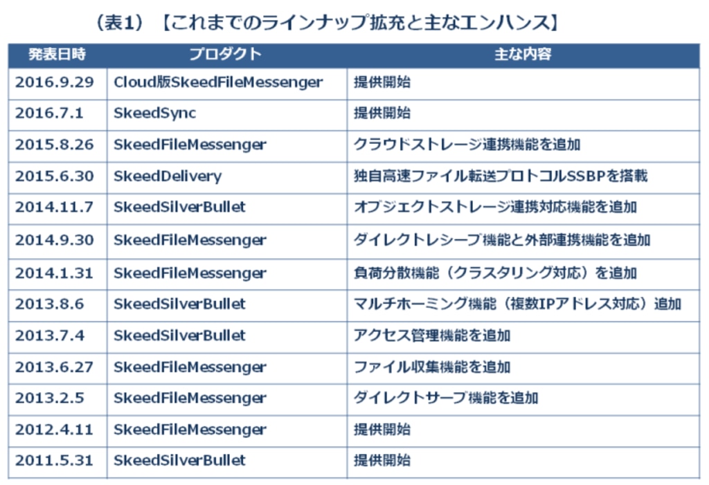 Skeedの高速ファイル転送ソリューションは2011年の発売開始以来、放送局やCG・アニメーション制作、ゲーム開発などのデジタルクリエイティブ業界、製造業や印刷業、研究機関など多様な企業ユーザー250社、3万ID以上に導入されています。こうした利用者からのご要望やお問い合わせに接する中で得られる課題や気づきを踏まえ、これまで機能の追加・改善、ラインナップの拡充といった取組みを実施してまいりました。(表1参照) 今回、その一環として、8月1日より改編し提供開始する新プロダクトラインナップ(7月25日既報)において以下の機能拡張を実施します。≪今回のエンハンスのポイント≫